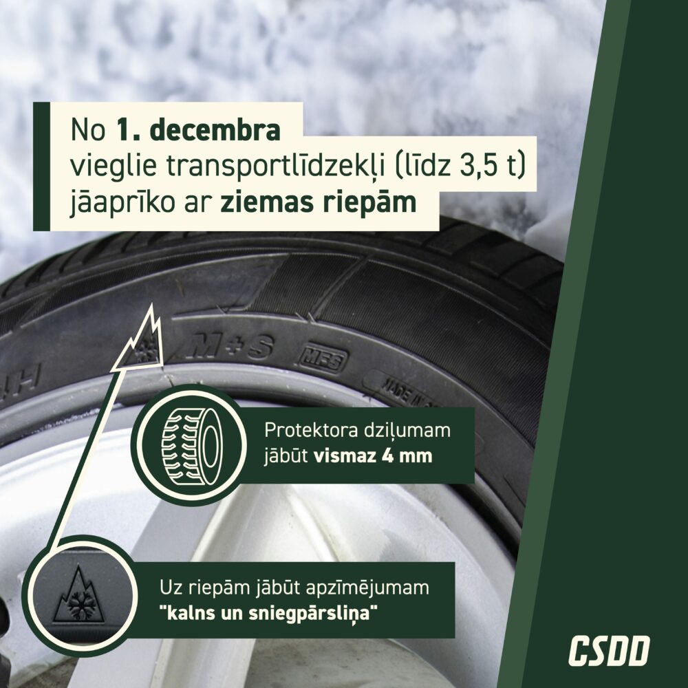 VAS “Ceļu satiksmes drošības direkcija” (CSDD) atgādina, ka ceļu satiksmes noteikumos noteiktajā ziemas periodā – no 1.decembra līdz 1.martam, ceļu satiksmē atļauts piedalīties vieglajiem transportlīdzekļiem ar pilnu masu līdz 3,5t, kas aprīkoti ar ziemas riepām, kas īpaši konstruētas izmantošanai sniega un ledus apstākļos un, kas marķētas ar apzīmējumu “kalns un sniegpārsliņa”. CSDD nāk klajā ar svarīgu ziņu autobraucējiem!