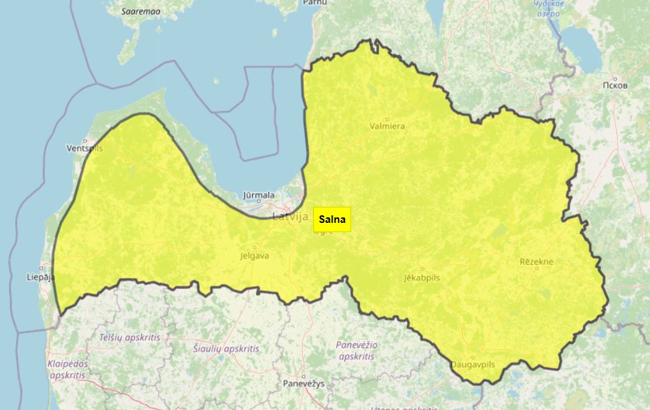 Latvijas Vides, ģeoloģijas un meteoroloģijas centra sinoptiķi teju visā valsts teritorijā izplatījuši dzelteno brīdinājumu par laiku naktī uz otrdienu.Izplatīts brīdinājums par laiku naktī uz otrdienu