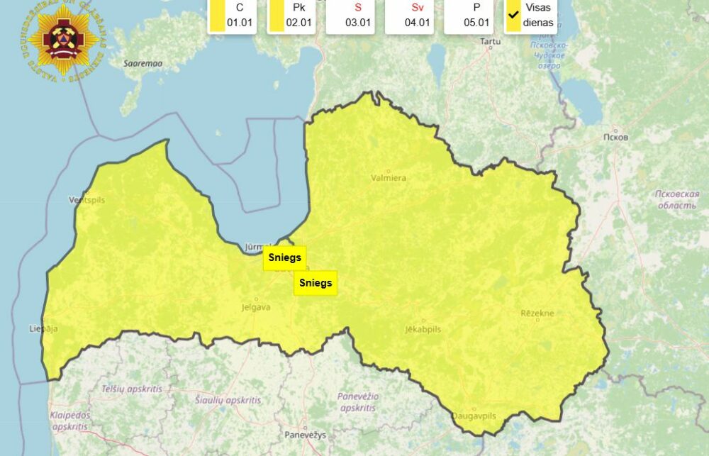 01.-02.01.2026. naktī Rīgā gaidāma stipra snigšana – sniega sega pieaugs par 5-8 cm. Ceļi būs slideni, apsniguši, un redzamība snigšanas laikā pasliktināsies.