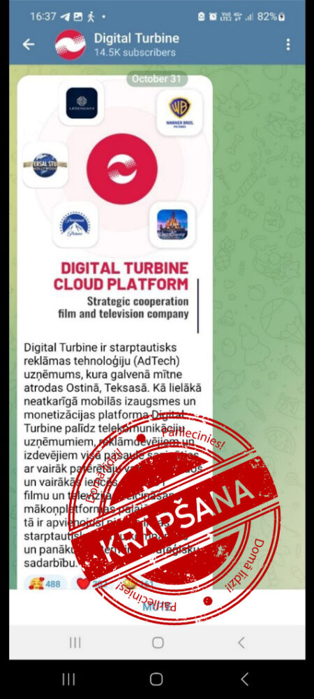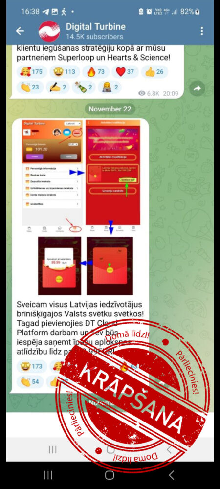 Valsts policija brīdina, ka pēdējo nedēļu laikā konstatēti daudzi krāpšanas gadījumi, izmantojot uzņēmuma “Digital Turbine” vārdu. Iedzīvotāji, meklējot iespējas nopelnīt, saskaras ar darba piedāvājumu, kas saistīts ar filmu skatīšanos. Lai uzsāktu šo “darbu”, iedzīvotājiem tiek prasīts samaksāt depozītu. Rezultātā ļoti īsā laika posmā Latvijas iedzīvotājiem izkrāpti vairāk nekā 20 000 eiro. Konstatēta jauna krāpšanas shēma, izmantojot “Digital Turbine” vārdu