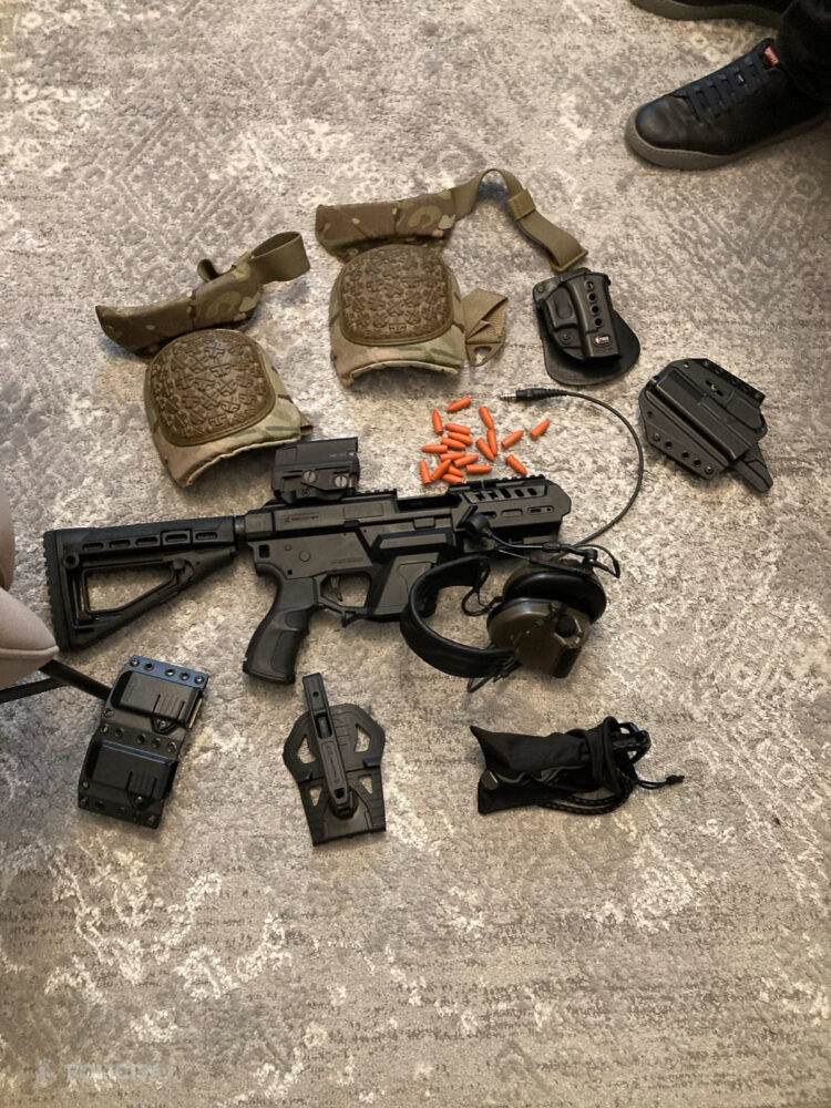 • divi šaujamieroči, 95 munīcijas patronas, četras airsoft rokas granātas, divas bruņu vestes;