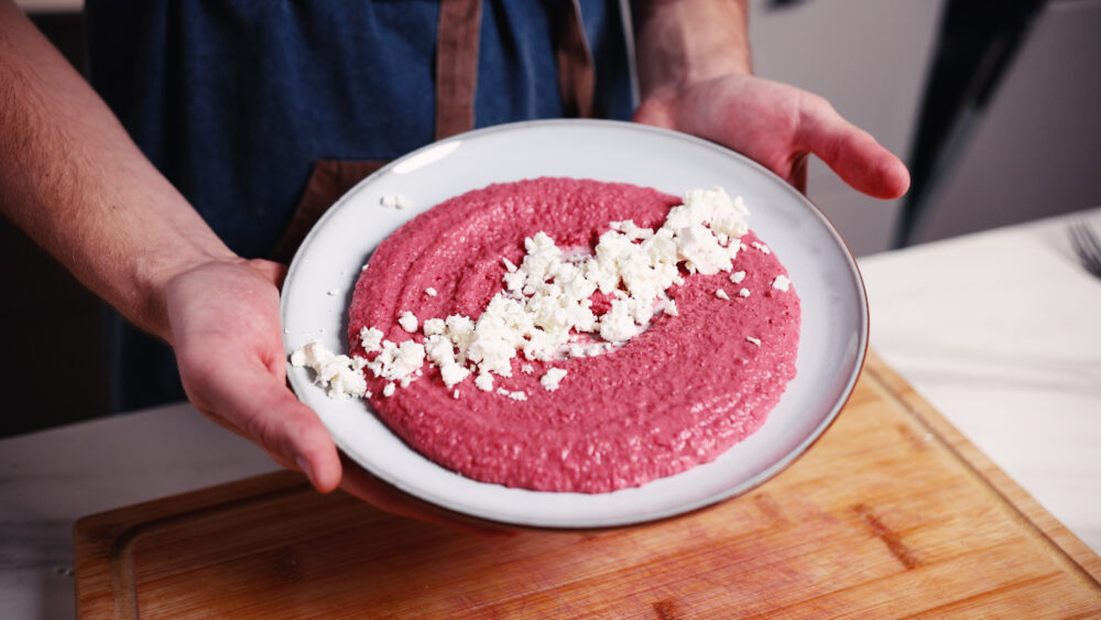1. Turku zirņus notecina un liek blenderī kopā ar “Spilva” bietēm, eļļu, sāli un pipariem. Pievieno 1 ēdamkaroti biešu marinādes šķidruma.