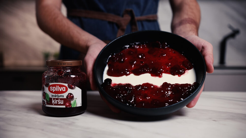 5. Ja ir vēlme izņemt no formiņas, tad tie neilgi jāiemērc karstā ūdenī un jāapgāž uz šķīvja. Dekorē ar “Spilva” ķiršu ievārījumu.